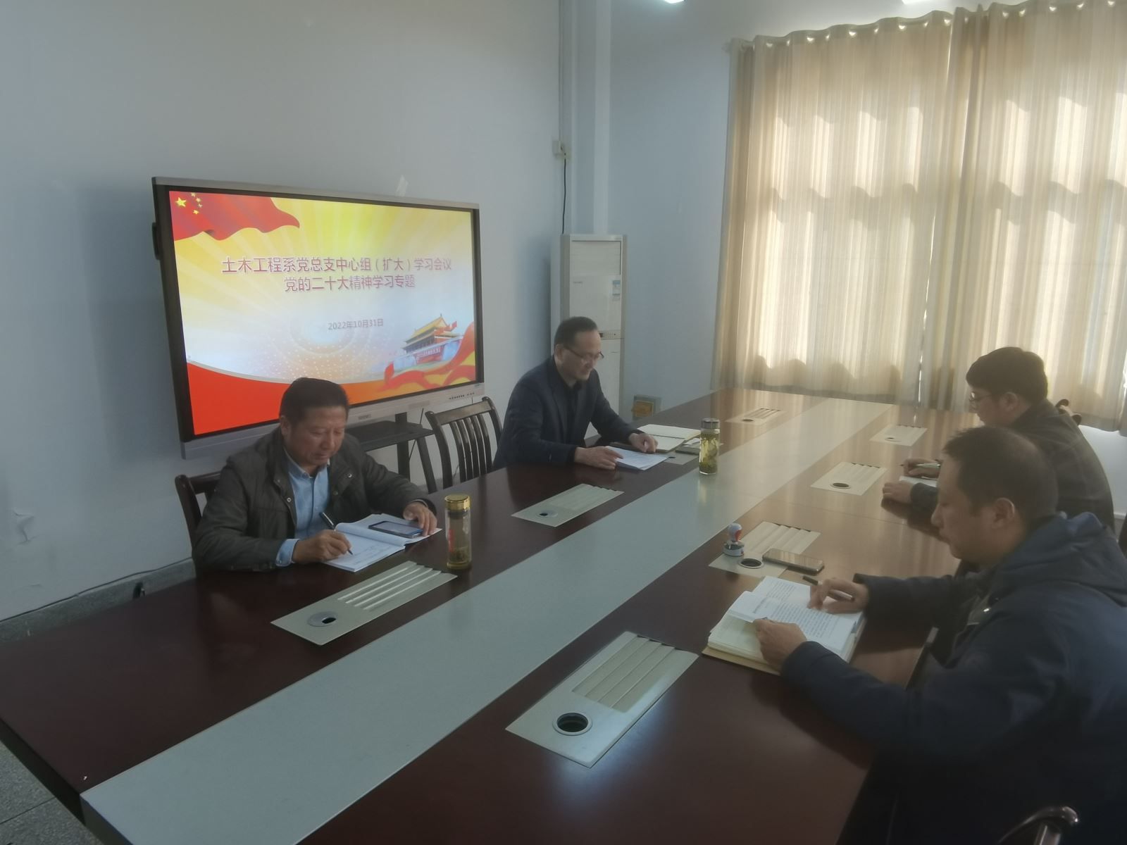 10月31日下午,土木工程系黨總支召開黨的二十大精神學習專題中心組(擴大)學習會議,系黨總支書記鄒建華主持會議。根據疫情防控需要,封閉管理留校人員鄒建華、王守勝、汪偉偉、梅維朝參會,其余黨員居家線上學習。