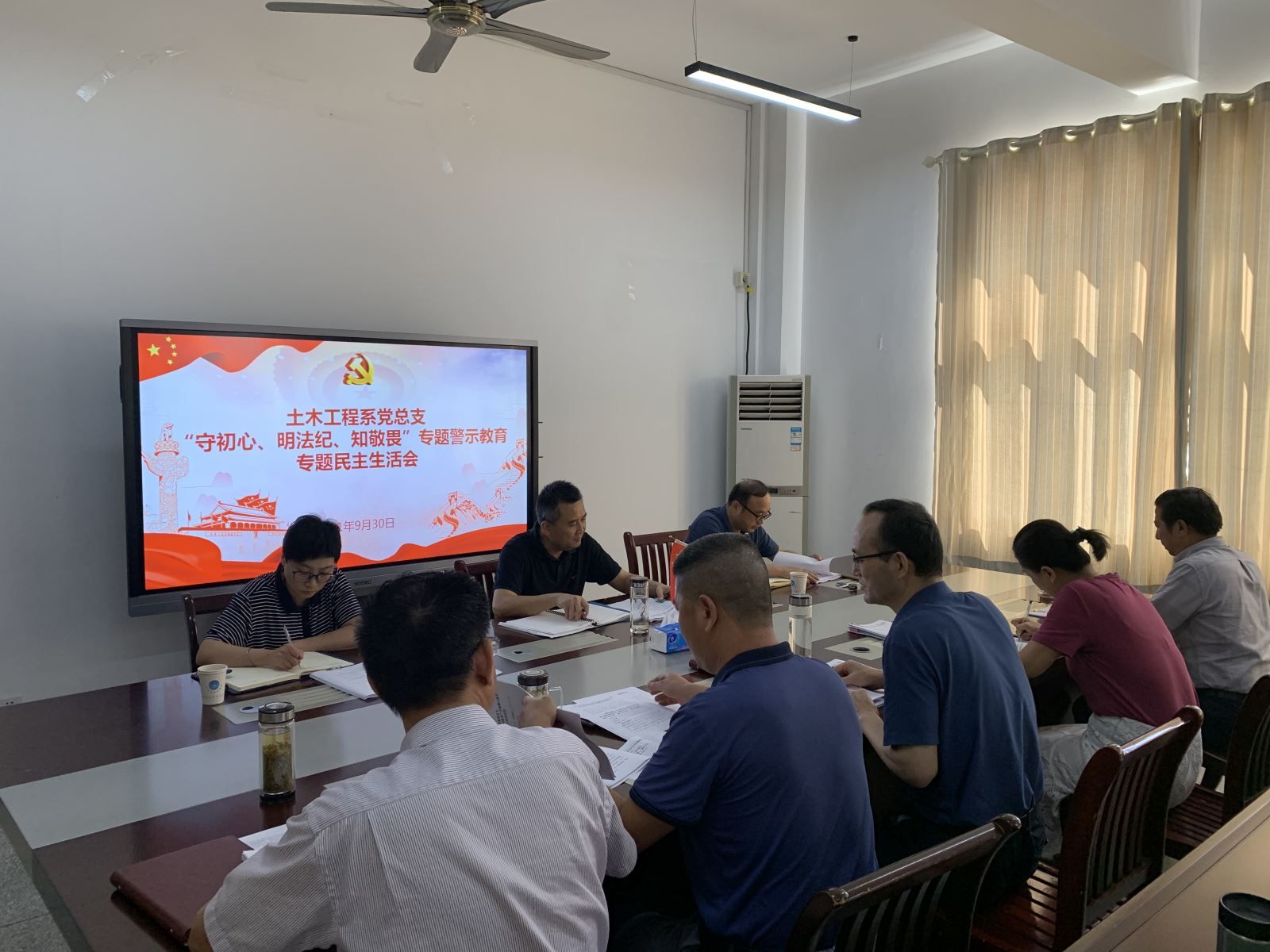 9月30日下午,土木工程系黨總支召開“守初心、明法紀、知敬畏”專題警示教育專題民主生活會。院黨委書記孫順利、紀委書記陳明、紀檢張娟主任蒞臨會議并進行了指導,系黨總支書記鄒建華主持會議。