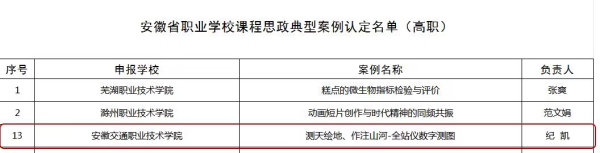 近日,安徽省教育廳印發《關于“六百工程”首批評審結果的公示》,我系葉生老師在此次評選中獲得“江淮技能大師”稱號;紀凱老師主持的“測天繪地、作注山河-全站儀數字測圖”獲批為安徽省職業學校課程思政典型案例。