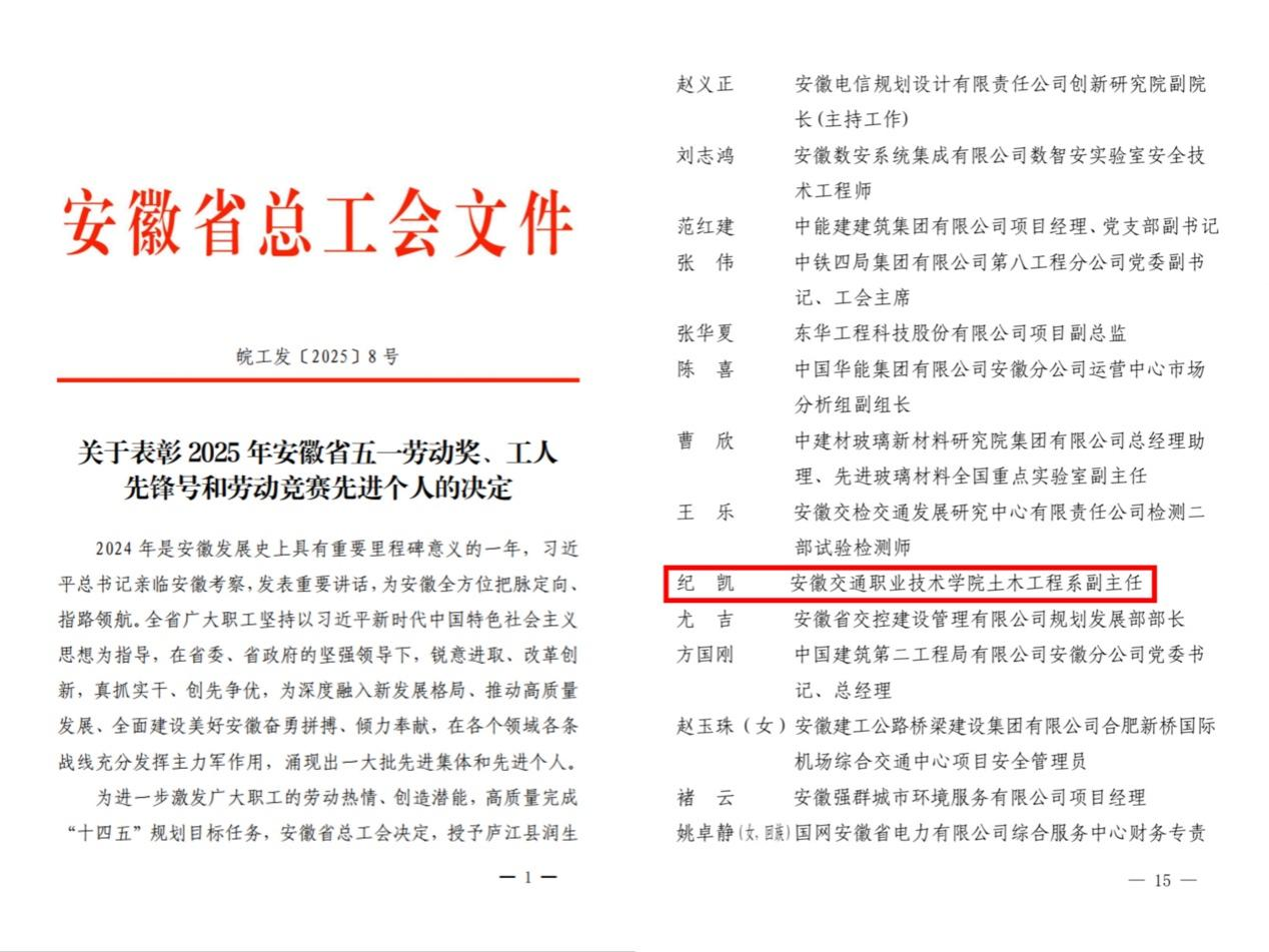 近日,安徽省總工會發布《關于表彰 2025 年安徽省五一勞動獎、工人先鋒號和勞動競賽先進個人的決定》,土木系副主任紀凱榮獲安徽省五一勞動獎章。