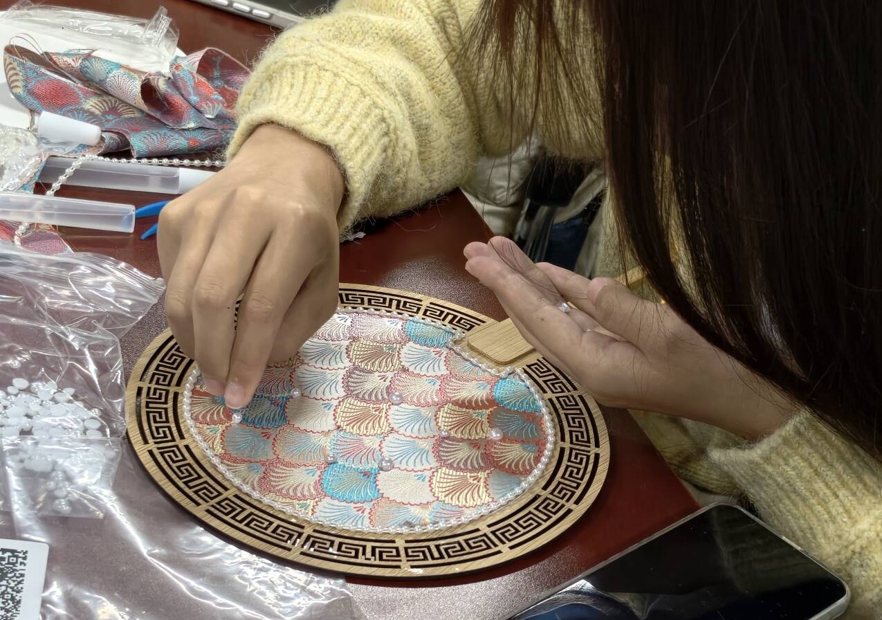 面向女學生的仿宋錦珍珠扇體驗活動中,工作人員首先介紹了仿宋錦的歷史文化背景,讓同學們了解這一“錦繡之冠”的魅力。隨后,同學們專注投入,細致粘貼宋錦、點綴珍珠,在動手實踐中感受非遺工藝魅力,增進友誼,提升文化認同感與審美素養。