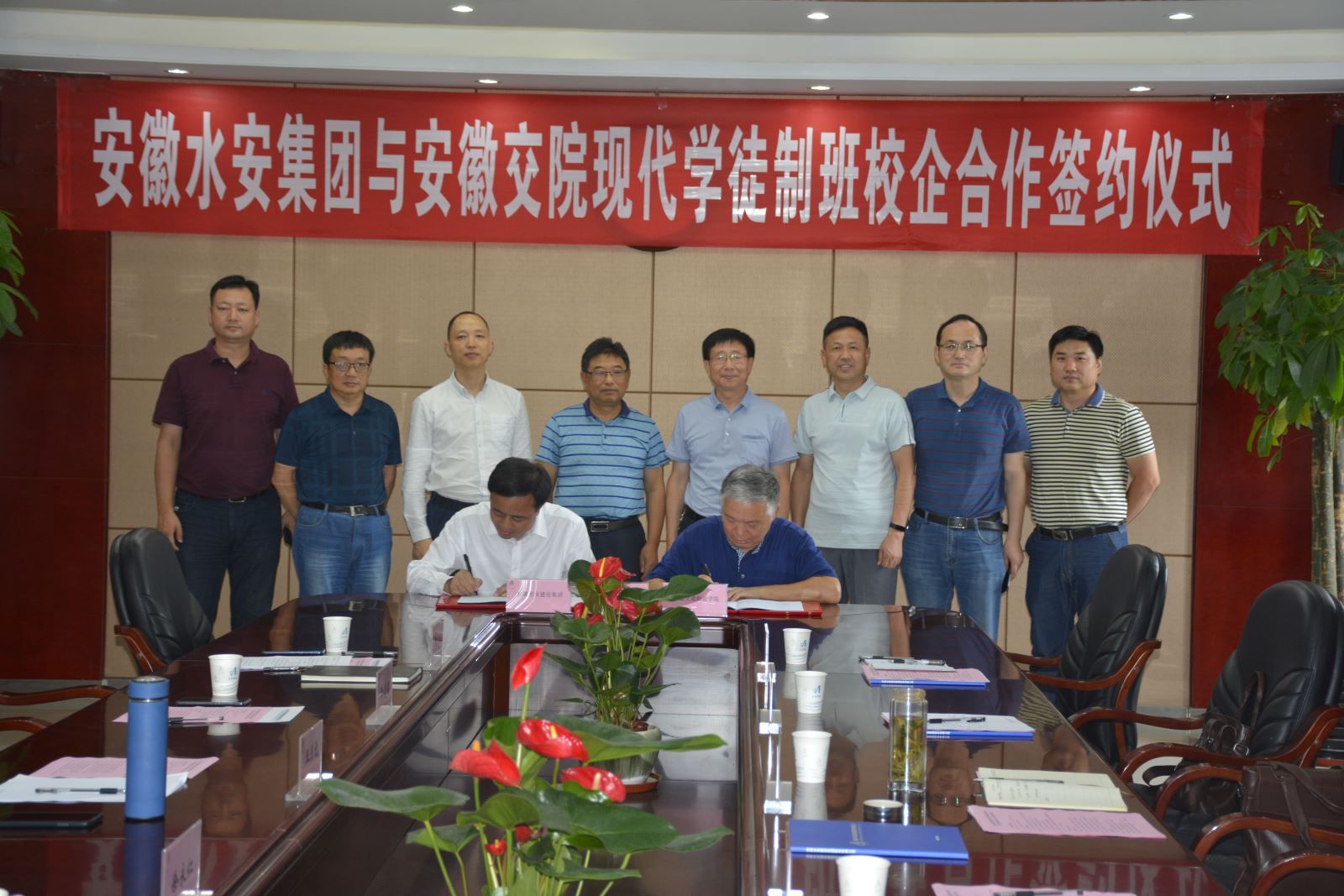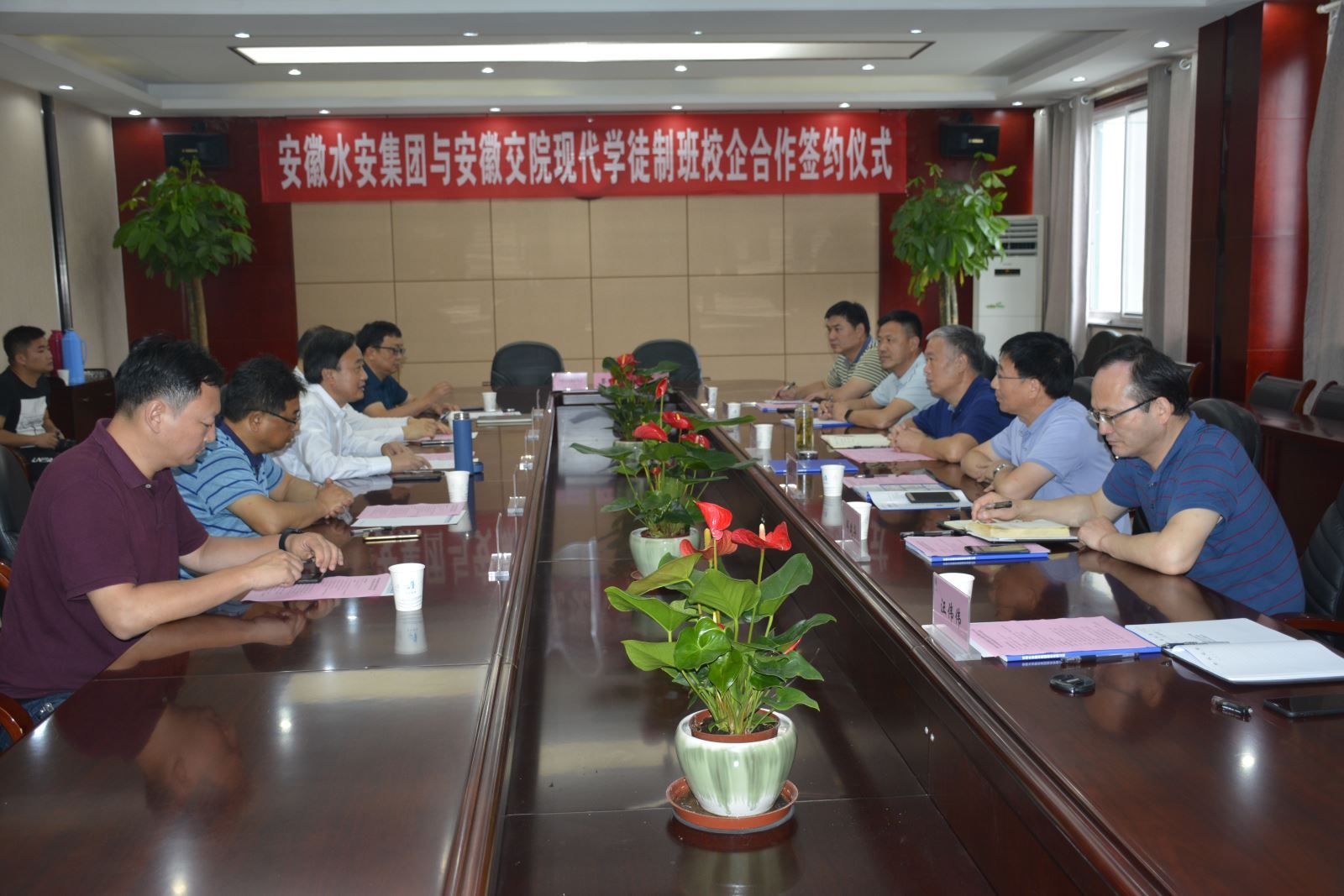 6月21日下午, 院長張國棟帶隊,赴安徽水安建設集團股份有限公司,簽訂現代學徒制班校企合作協議,副院長王豐勝、土木系主任王常才、黨總支書記鄒建華、院質管辦主任劉超陪同前往。安徽水安集團總經理王月元、副總經理黃友保、副總經理胡先林、副總經理徐永仁、總經理助理趙曉峰參加簽約儀式。