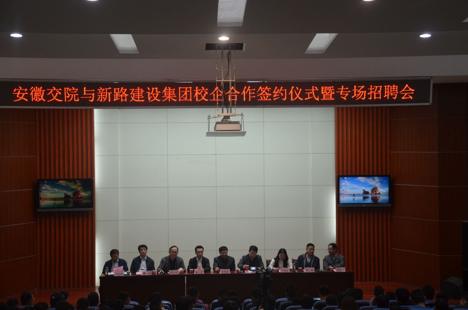 2018年10月18日,我院土木工程系與安徽省新路建設工程集團有限責任公司共建“安徽新路路橋班”現代學徒制校企合作班簽約儀式暨新路集團專場招聘會在學院八角樓報告廳舉行。