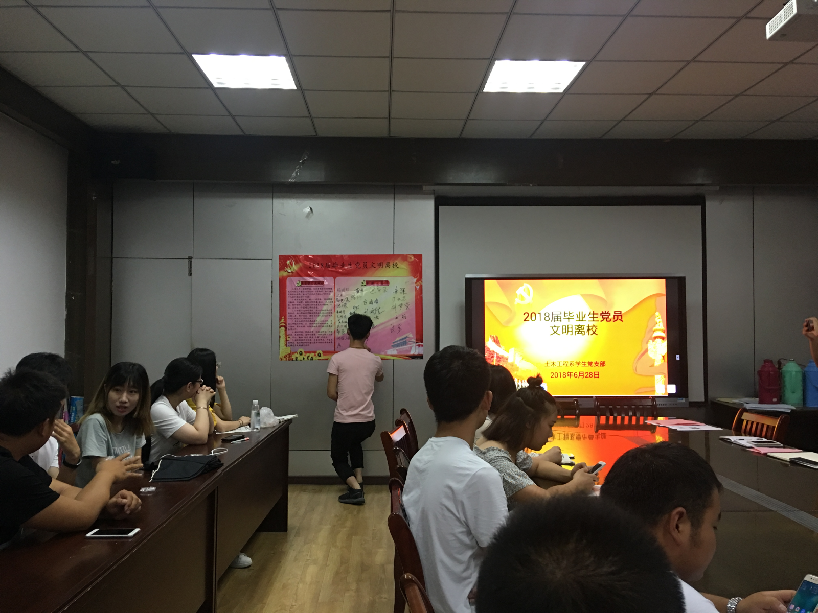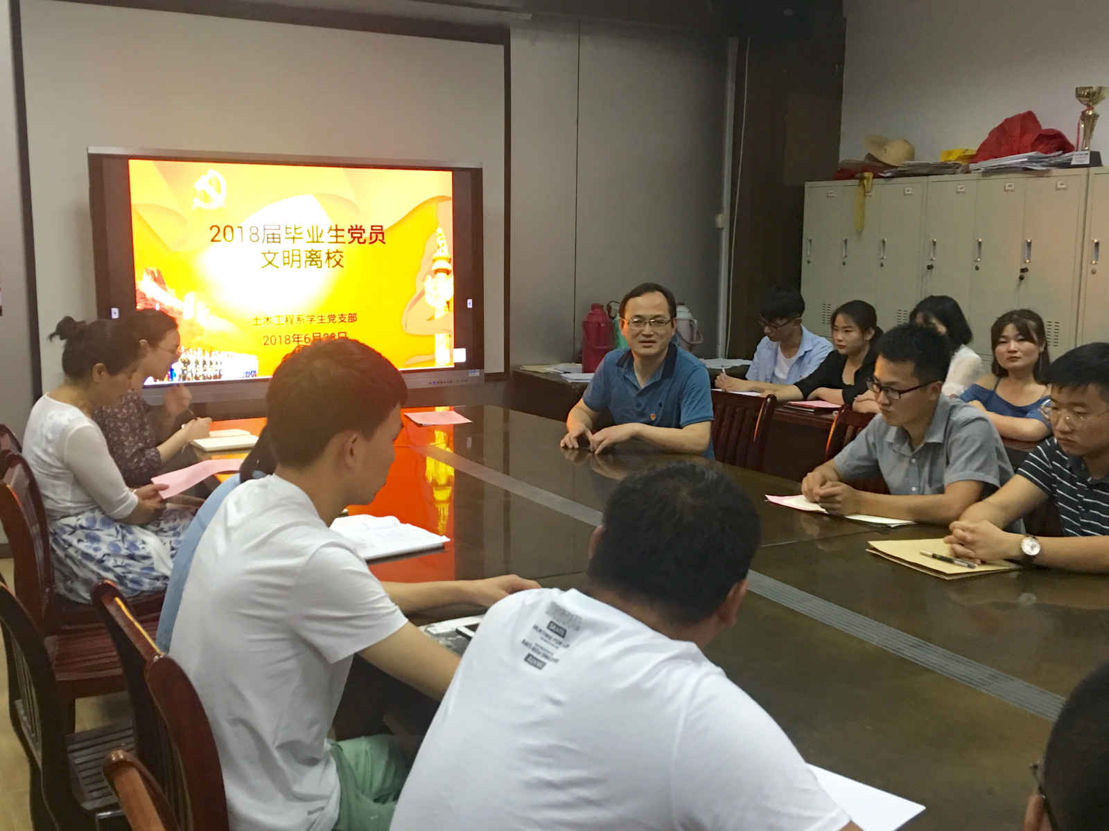 為了切實做好2018屆畢業生文明離校工作,發揮學生黨員的先鋒模范作用,6月28日上午在系會議室開展了畢業生黨員文明離校主題教育系列活動,參與活動的人員有系黨總支書記鄒建華、學生黨支部書記汪愛娥、支部教師黨員及2018屆全體畢業生黨員。