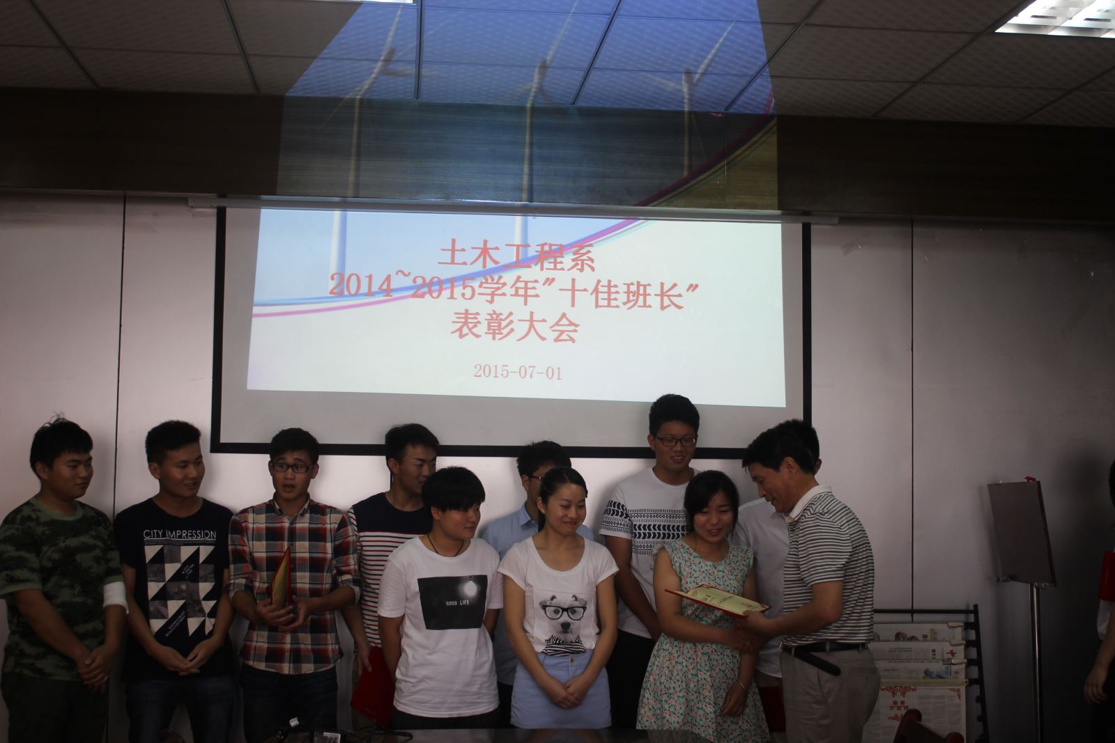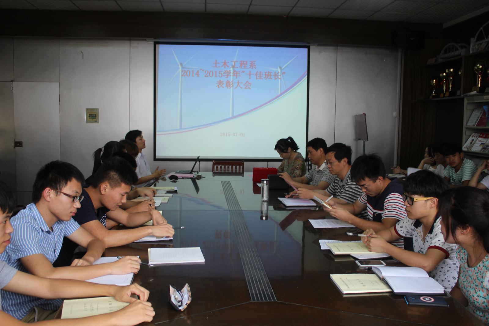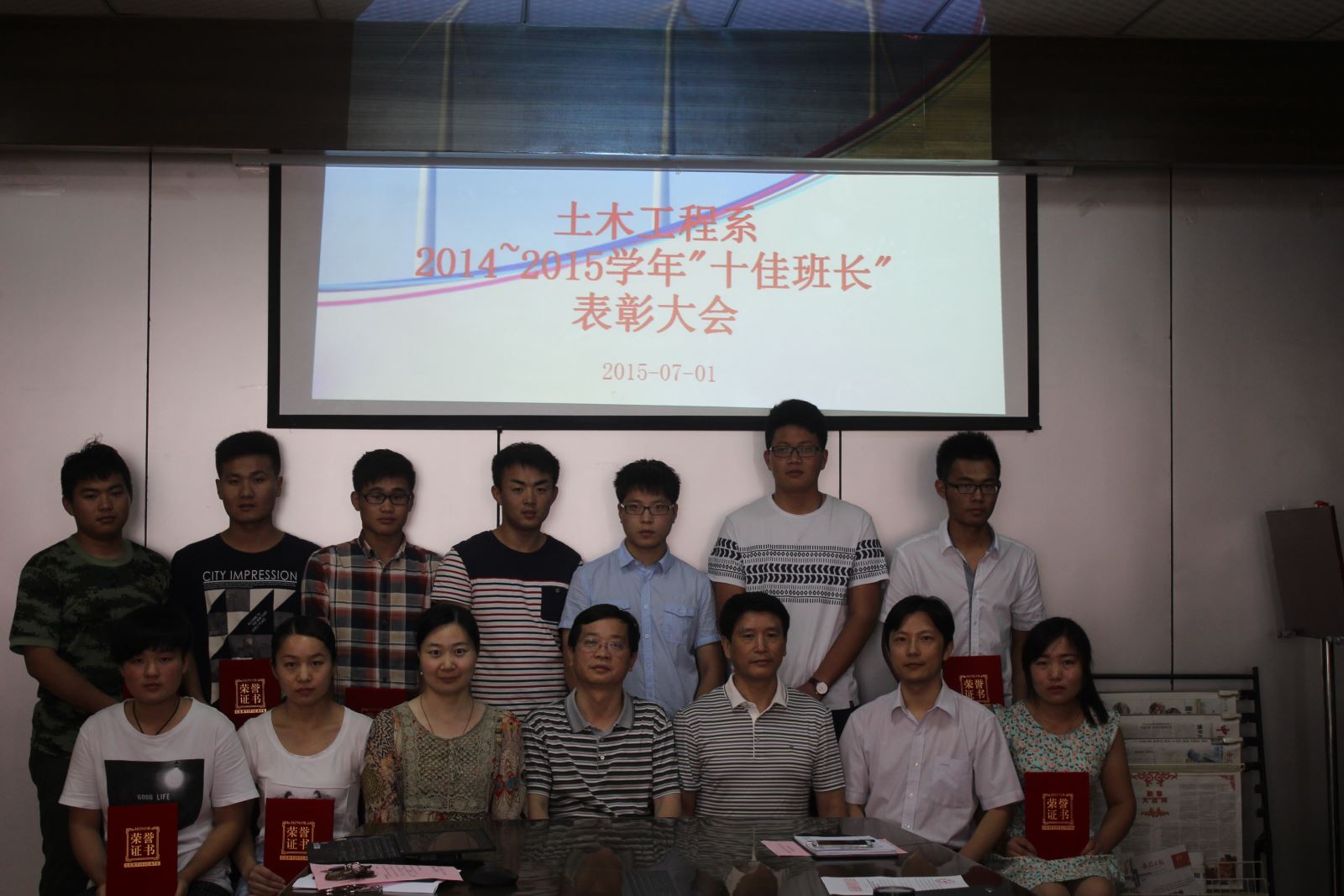 2015年7月1日下午四點半,土木工程系在會議室召開了2014-2015學年“十佳班長”表彰大會暨期末班長例會。系黨總支朱文勝書記、陶權副書記、系教學秘書郭強老師、系主任輔導員趙婧老師以及13、14級各班長參加了會議,會議由趙婧老師主持。