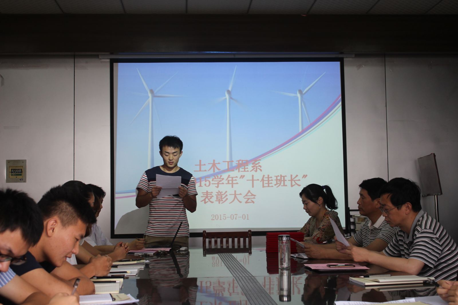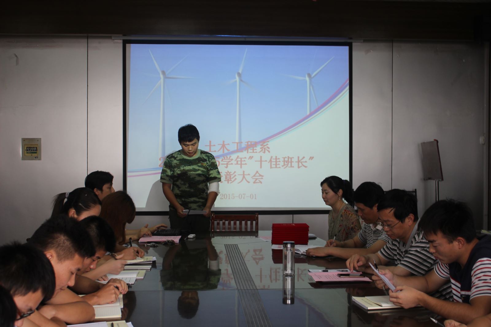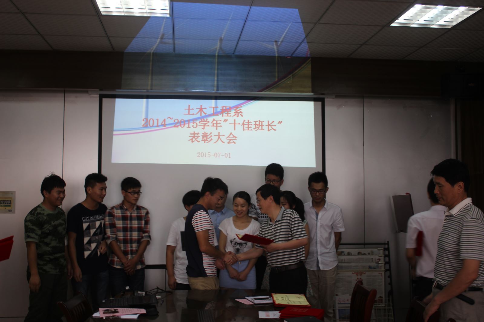 2015年7月1日下午四點半,土木工程系在會議室召開了2014-2015學年“十佳班長”表彰大會暨期末班長例會。系黨總支朱文勝書記、陶權副書記、系教學秘書郭強老師、系主任輔導員趙婧老師以及13、14級各班長參加了會議,會議由趙婧老師主持。