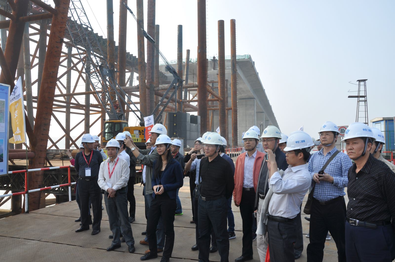 10月23日,與會人員參觀考察了在建的望東長江公路大橋建設現場,該項目為G35濟廣高速公路跨長江段,全長38.025公里,融合路、橋、隧等多種建設元素;其中大橋長3608米,跨江主橋長1250米,主跨長638米,主梁為PK型分離雙箱鋼混疊合梁,鉆石型主塔高216米,為目前國內外最大跨度的鋼混疊合梁斜拉橋;橋梁寬度33米,設計速度120公里/小時,概算投資50.38億元,預計2016年底全線通車。