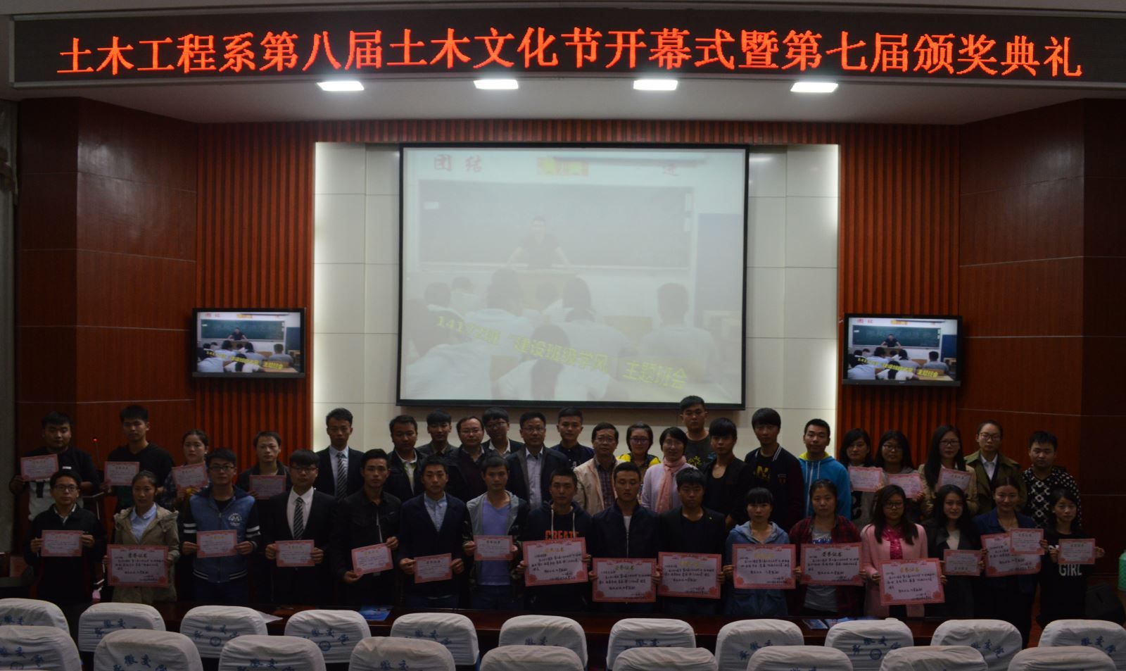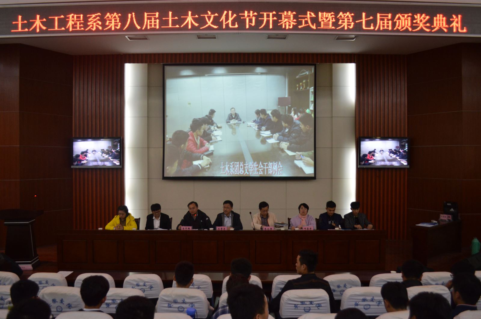 為銘記歷史,弘揚抗戰精神,加強高校宣傳思想工作和校園文化建設,11月4日晚七點,土木工程系第八屆土木文化節暨第七屆頒獎典禮在北區多功能報告廳隆重舉行。土木工程系主任王常才老師、土木工程系黨總支書記朱文勝老師,土木工程系學生管理辦公室何榮基老師、呂中國老師參加了本次會議,開幕式由呂中國老師主持。