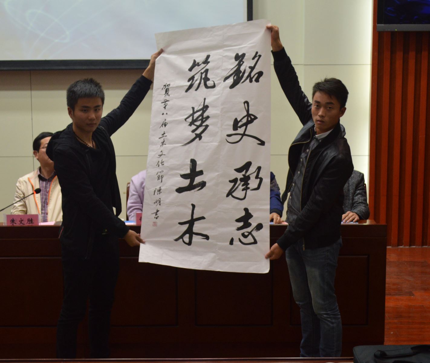 現場還展示了院黨委副書記、紀委書記陳明和院黨委副書記孫順利為第八屆土木文化節開幕式所題的墨寶。最后,王常才主任宣布“銘史承志,筑夢土木”第八屆土木文化節開幕。