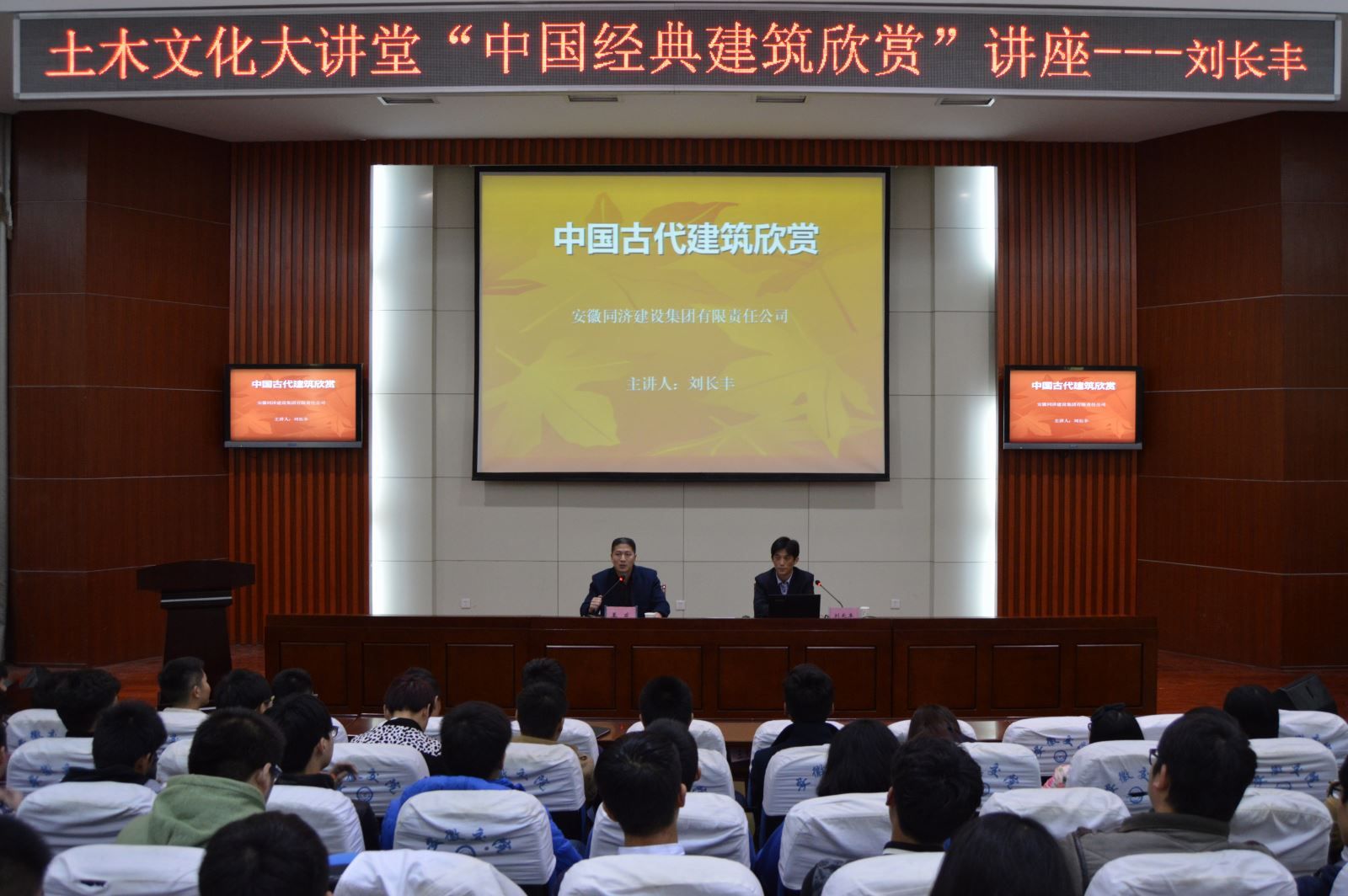 11月19日晚7點,同濟建設集團黨委委員、工會主席、安徽省開明畫院理事、省建筑業協會企業文化專業委員劉長豐應邀來院為我院學生作 “中國經典建筑欣賞”的講座。