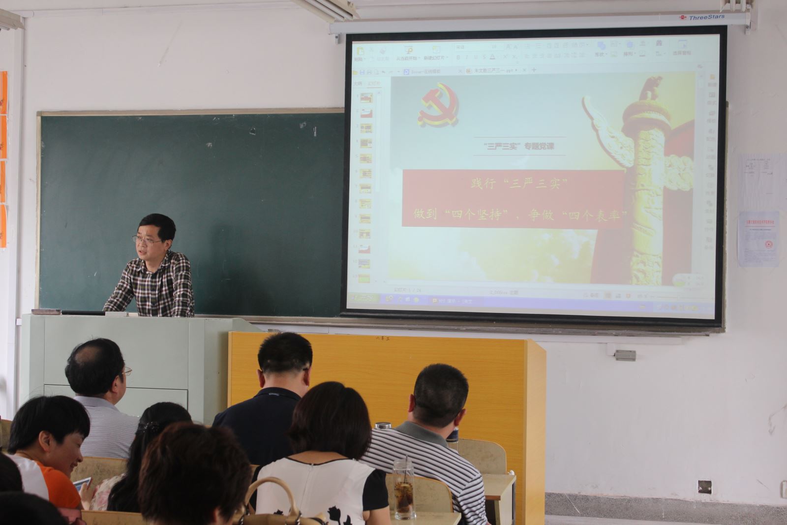 6月10日下午2點半,土木工程系全體教職工黨員在教學樓318教室,認真的聽取了朱文勝書記關于踐行“三嚴三實”,做到“四個堅持”,爭做“四個表率”的黨課,院黨委陳明副書記也應邀前來指導。