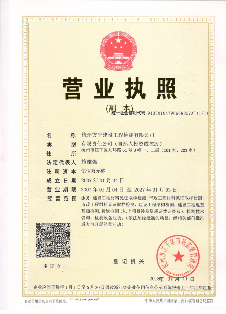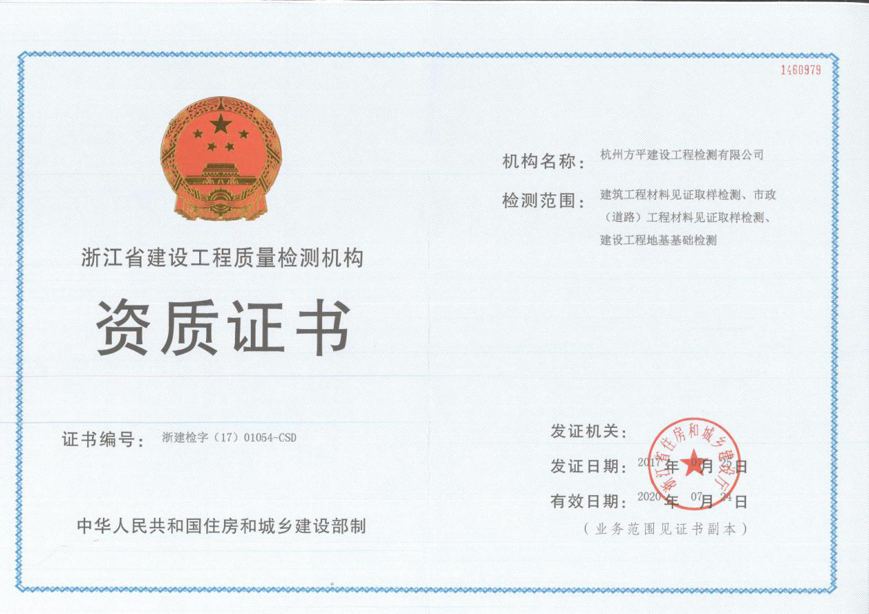 杭州方平建設工程檢測有限公司,是一家取得浙江省建設廳建筑工程檢測機構資質認可的檢測單位[證書號:浙建檢字(17)01054—CSD],具有獨立開展市政(道路)工程材料見證取樣檢測、建筑工程材料見證取樣檢測、地基基礎檢測能力的第三方檢測機構。