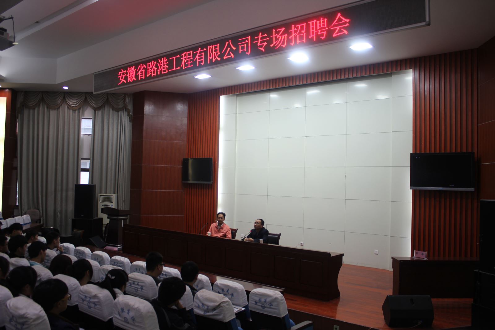11月5日下午,安徽省路港工程有限責任公司在院北區學術報告廳舉行專場招聘會,負責此次招聘的是該公司人力資源部王永亮部長,我系副主任肖玉德老師主持會議。來自路橋、港口、隧道、造價、安全工程等專業的2016屆畢業生三百多人來參加了招聘會。