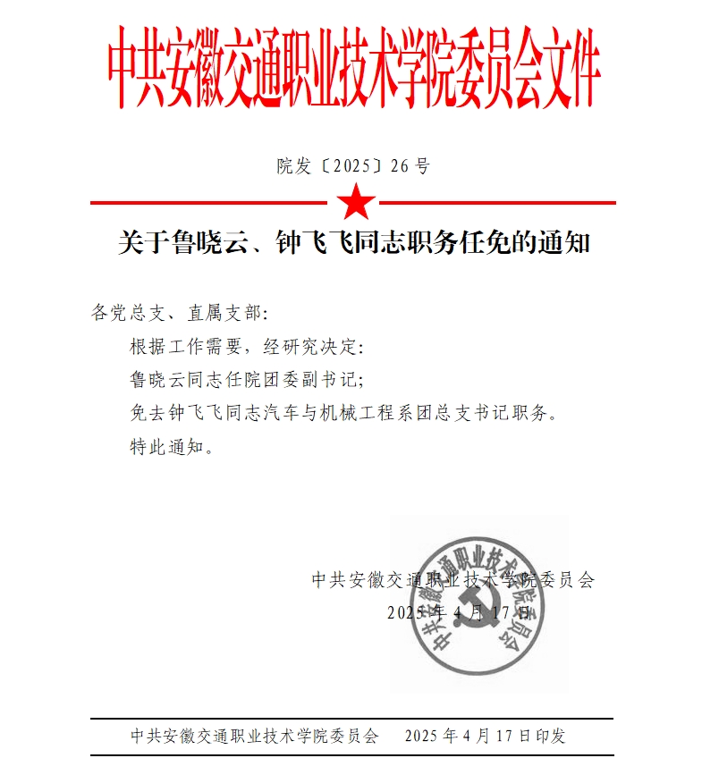 關(guān)于魯曉云、鐘飛飛同志職務(wù)任免的通知