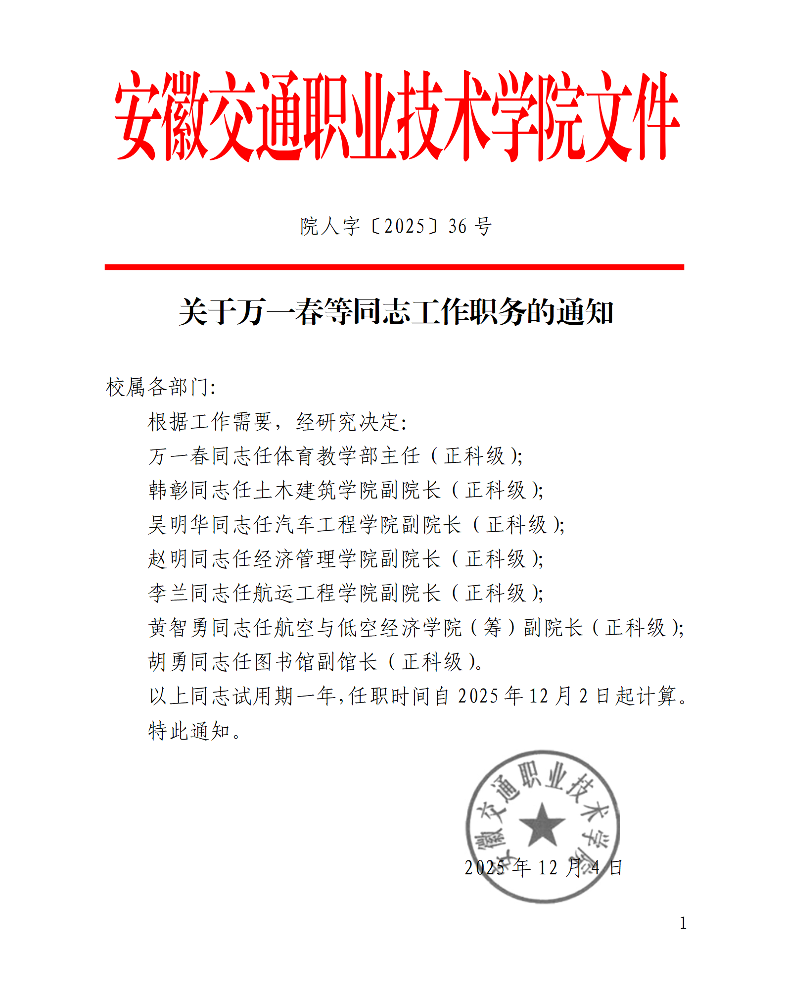 關于萬一春等同志工作職務的通知