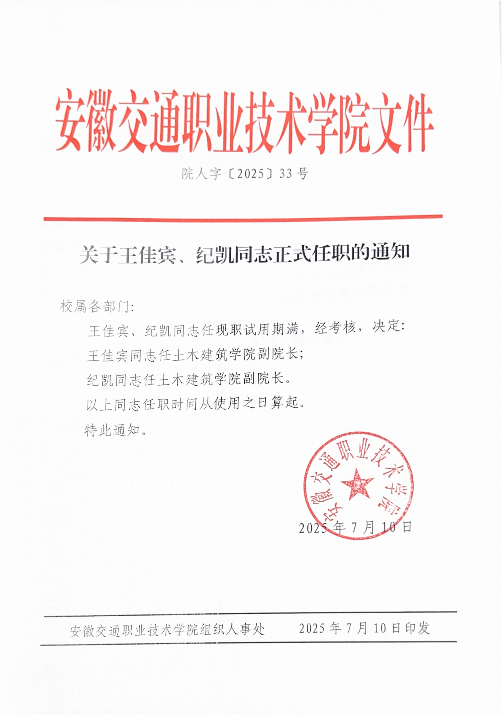 關于王佳賓、紀凱同志正式任職的通知