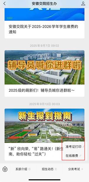 1、微信公眾號“安徽交院招生辦”繳費和準考證打印