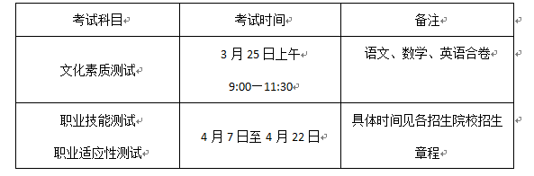 考試科目為文化素質和職業技能測試(或職業適應性測試)。