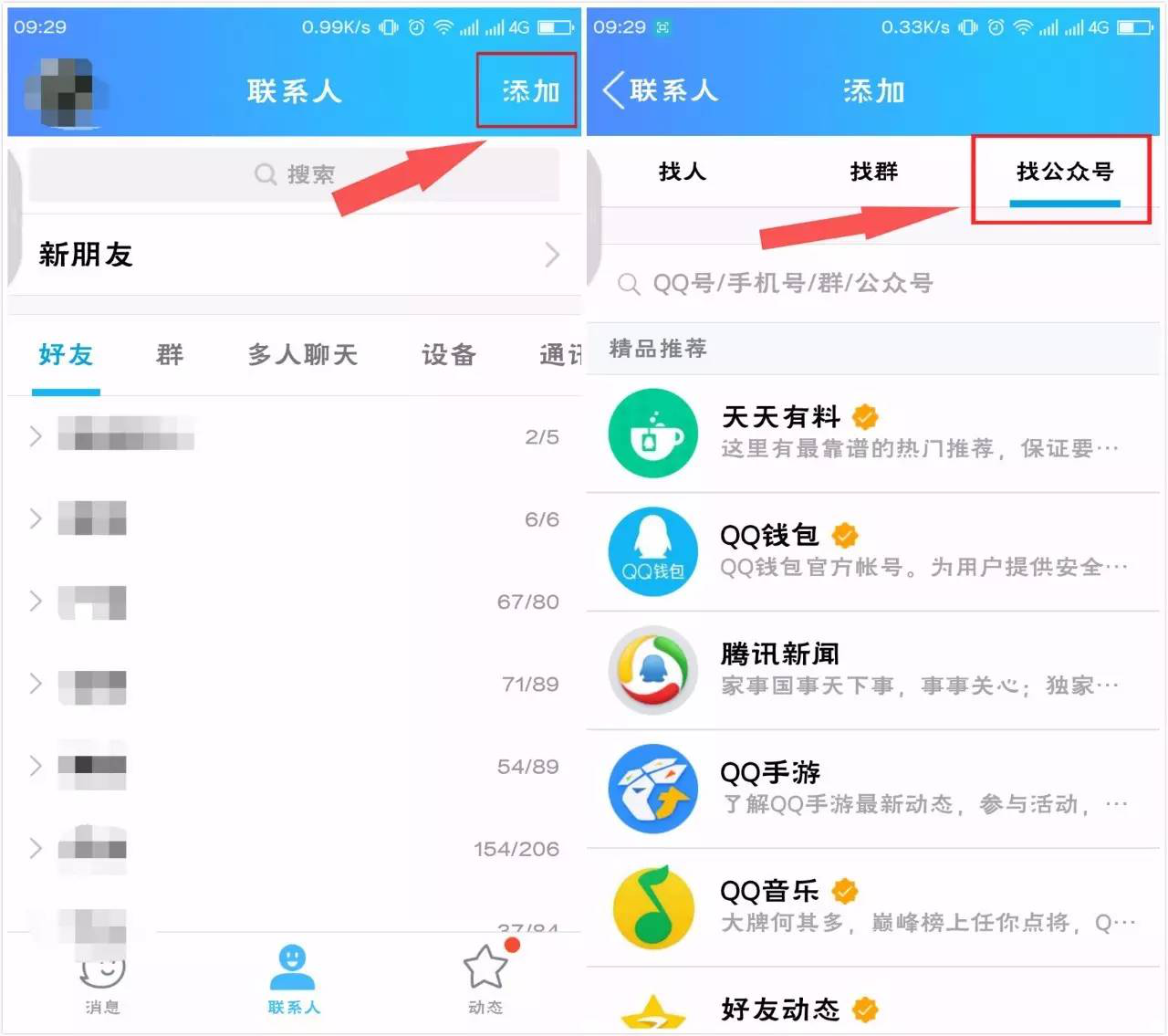 一、點擊QQ聯系人頁面右上角“添加”,選擇“找公眾號”