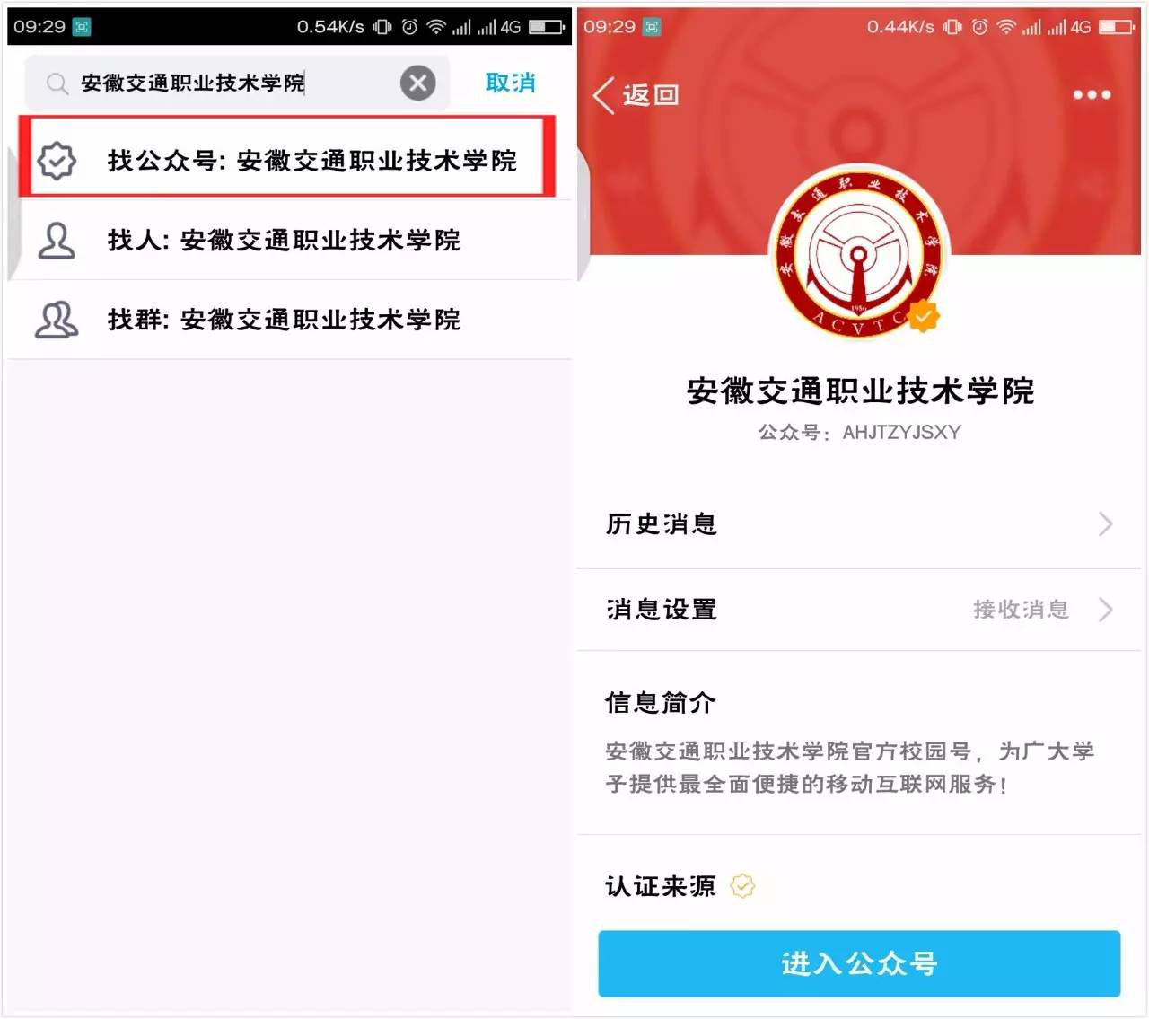 二、輸入“安徽交通職業技術學院”搜索,選擇第一欄,點擊關注公眾號