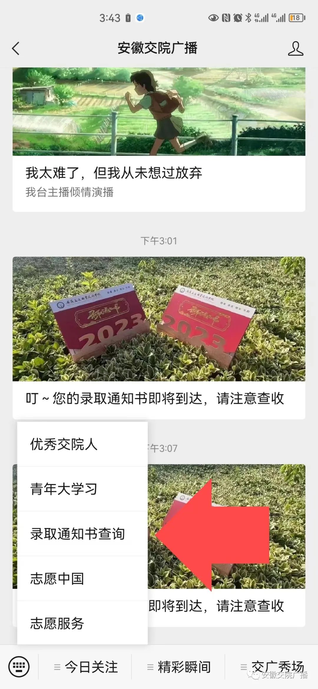 關注安徽交院廣播微信公眾號,找到“錄取通知書查詢”