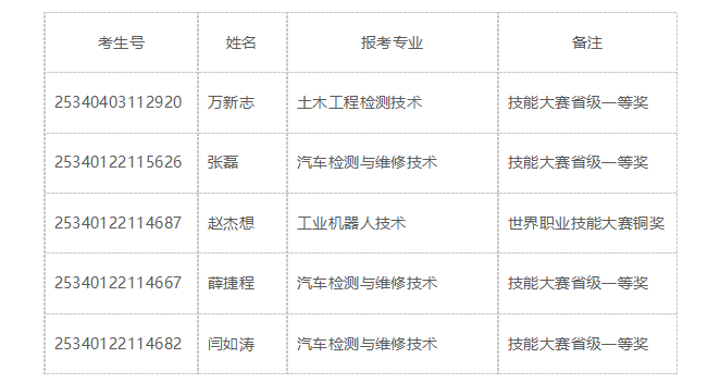 依據(jù)教育部、安徽省教育廳有關(guān)政策,按照我院2025年分類招生章程相關(guān)規(guī)定,對符合條件的技能拔尖人才考生,免于職業(yè)技能測試。經(jīng)過對報名考生所提交的資料進(jìn)行審核,有以下5名考生符合技能拔尖人才條件,現(xiàn)公示如下: