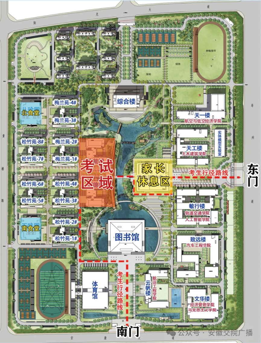 1、送考車輛可由壽州大道駛入安康大道(校園南門),或經黃樓路進入校園西北門。